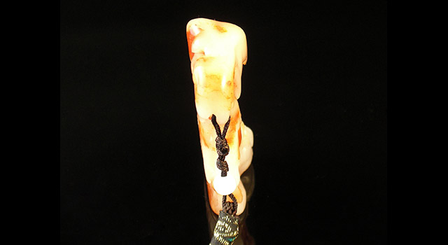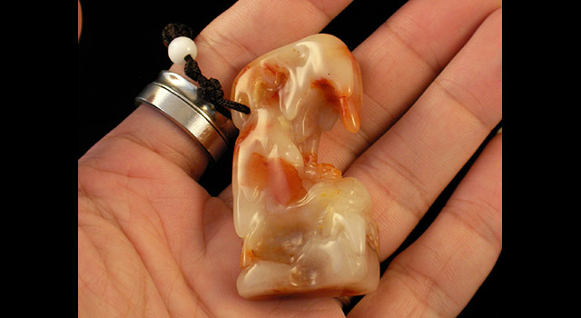 【雕工】:此件手件,圓雕一睡狸在山坡斜睡,卷尾回首伏身,意態自然流順。四周雪和岩壁配合很好,把睡狸好好地祥和地保護著,睡狸一醒大地已回春,早春意象濃萬象更新,意寓逸致。由於材料在骨邊取肉,雕師已為這石頭百份百作出交待和用心了。東西可手玩又可掛飾,底部可作篆,隨形章。各自逸藏閒玩之能事呀!