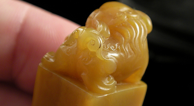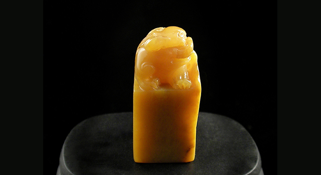 【雕析】:優質堀性黃杜陵晶-古獅鈕正方章