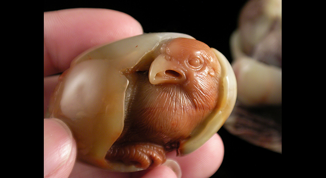 【背後典故】 :實說敝人看石頭的日子也不算小了。當年當日看了這東西東西南北上下左右整整多遍,心裡很是喜歡這件的,雖然敝人偏愛印章,但好的擺件也是會令人回味再三的。這個雛雞破殼,算是化腐朽為神奇,無可挑剔的為石頭處理得綿上添花了。的確要讚! !
