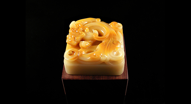 【作者】:葉承基,作者是姚仲達大徒弟。葉承基,現為壽山石文化藝術研究會會員。 78年出生在羅源,95年中學畢業後在工廠做過工,原本只想做做盆景之類的工作,無意中卻被壽山石雕刻大師姚仲達發現了他的天分,並收其為徒。開始,他只抱著試試的心態,後來發現自己喜靜,而這一行也與自己性格比較吻合,慢慢地就喜歡上了壽山石工藝美術,早期主要以臨摹淸工作品為主,還接受過李來儀老師的指導,學印鈕、古獸雕刻。在逐漸有了自我的文化與審美意識之後,認為簡單臨摹淸工印紐、古獸過於單一,在師父姚仲達的影響與鼓勵下,為了提高美術技藝和人文修養,進入閩江學院美術系進修了兩年,天資聰慧的他很快拿到了畢業證,後又考入了景德鎮陶瓷學院,並順利畢業。近年,作品擅長於印鈕、古獸的創作,作品注重吸收先秦藝術精華,多次獲獎,其中《禮器與螭》和《玉飾》分別兩次獲得風華盃銀獎。