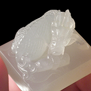 因此在壽山石雕的演翻麒麟,多為麒麟背書、踏書、吐書之神態,因為典故古往開來的關系,用書為三卷(春秋之時書是用竹作卷的)或是三籍,而伴之者、或水或雲。