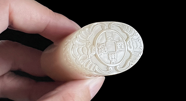 五福和合:印鈕刻五隻蝙蝠像徵”五福”,若加上一個盒子,取”盒”與”合”諧音,飛出五隻蝙蝠,則稱”五福和合”。