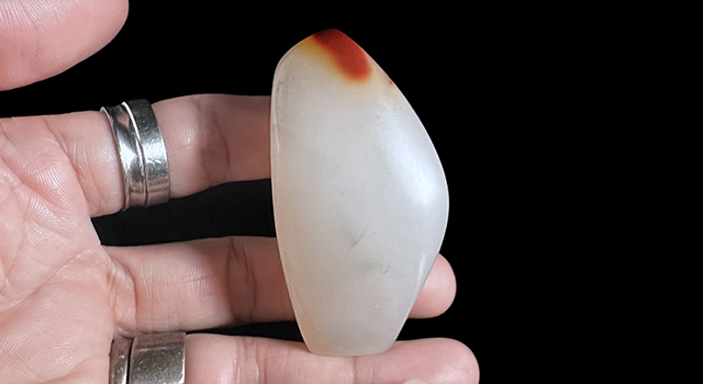 而普通高山白的石頭相對來講較為鬆軟,打磨後光水遜於荔枝石。二種石性的對比體現出來的結果是,荔枝石的白度更高,有的石頭縱經幾十年,也不會被油養透;這種現象可以從台灣回流來的荔枝貨得以觀知,一般白色的荔枝石歷經二三十年,外在最多形成包漿,內部還是高質量的白度。高山的石頭由於不夠緊密多數能夠吃油,差者變黃變暗,佳者成蛋清體質。在此,並不是批判高山白的不好,一些達到晶、凍的體質,有時價值並不比荔枝低。