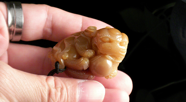 【背後典故】:請諸君用眼睛底韻看東西,不是耳朵。東西當初店東說是田黃,記得那年花好月正圓,路經一店。店內已有幾個哥們聚首求教,店東對這件作品指出了田黃的色相、銀包金的味道、還有紅根,而且田黃的六德也有,幾個哥們連連點頭口水流,最後價位企得兇….. 討論一翻後無奈走了….. 我帶上耳機四處走動,在對岸展櫃看章,心耳在傾聽(不插嘴這是行內規矩……),店家見友人帶來的朋友一個個走了,才來招待小堂這個默生人,當敝上手這件東西時,店東眼睛一直注視在我面上和我盤石的手…… 大約這30至60鈔的沉默,店東腦內應該閃動了幾個方案,等我先開口,問上等一句,就套上他回話的準備…… 60鈔後我堅定和近距離互視他雙眼說:這大山黃東西很優!….. 店東之前準備回話的思想給我打亂了陣。我又對作品說了約15分鐘的話,店東一直聽沒說話!(說什麼小堂這裡就不細述了)……. 臨離開前店東叫我出個價看看。結果(也就不細述了)…… 呵呵,這寶就這樣給我牽走了!福安。