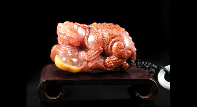【雕功】:作品是福州圓雕類施藝把件,獸獸做形行,型態感覺可人,我喜歡橫著那手握件,古獸做的挺工整啊。貔貅整體泛著老熟的紅艷,在鮮紅的獸件下,配之獸頭桃花,獸身硃沙,左瓜爬金,右瓜爬桃花(元寶)的巧色雕功輝化… ..令作品相得益彰渾然天成,整體散發著成熟討好的氣息,這類爬錢只進不出的手玩伴是走營商討財務的朋友至愛,愛財的誰不愛身邊養一件這類小瑞獸為自已服務服務,您是否也有如此感覺呢!嘿嘿….
