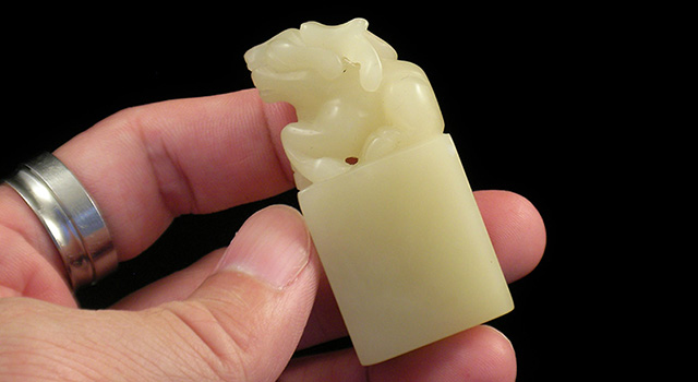 【雕功】:福建傳統制圓雕類作品,古獸含芝鈕日形章,古獸造型別緻。作者依形順勢,利用這樣一黃一白石材的色相取巧,強烈色差特點施藝巧色巧雕靈芝,巧色得來特別生趣,早年雕功,未到雕功極好水平,但也不錯啦….,整體秀氣,線條樸韻,品相靈巧可愛。