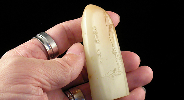 【雕工】:雕工精緻,薄意畫意不凡,很有國畫之風味,此章採用薄意技法,薄意線條清晰自然,作品疏密佈局有緻,取石之長,淺刻細描,主題為雕”三峽春曉”畫面清幽,山峰險奇有意趣,線條流暢渾化、風味奇秀,一派國畫奇峰俊壁影入眼簾。內韻令人尋味,畫意石中自生,雕工就不再細說了,大家看圖吧。