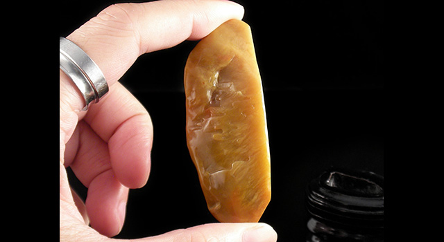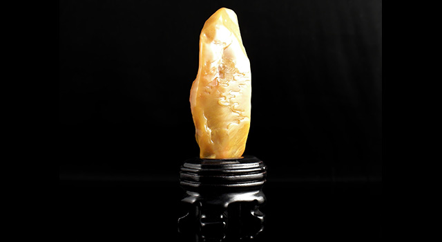 【背後典故】 :當時這東西敝人打算兩用的,在家時就擺回木座架上,打上左右兩個小射燈,就是一件倒很有意思的文化風韻的書房小擺。再在頂端鑽個小孔,就是一個很美人的晚禮掛墜,配個活動扣,坐車走路看書,手摸隨身,多甚悅意! ……那天打算帶到玉石市場為這東西加工,匠大叔上手看了看我,把這黃石頭反反覆覆上手端摸著,對著我說想清楚了認真的嗎?我搶口說當時,匠大叔一這彎腰取工具套一邊自言自語說太可惜了,純純的已經很好。本來去意堅強的小堂,腦內閃念一下馬上叫停。心想相信能懂它的人自然會懂,搞這樣那麼多幹嗎? ?