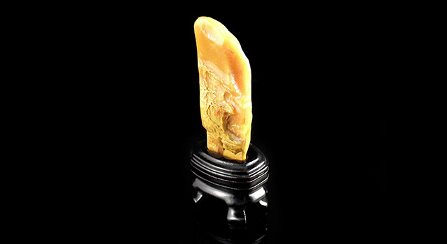 【石種】:昌化田黃石,産於浙江臨安縣昌化鎮。是以葉蠟石爲主要組成的一種掘性獨石, 具油脂光澤,微透明,色純無雜質者稀貴。所以爲浙江石質最好的品種。昌化田黃石均産在開採雞血石岩洞腳的山坡上的泥土裏面。是億萬年前,地殼變動,散落在山腳的獨石,再經過土壤、水份、地溫、色素的長期浸蝕,二次生成的原石。其演變過程是極其緩慢而又漫長的。這種石頭的肌理往往是純淨無暇,細潔溫潤,它的特點是皮好質潔,溫潤可手寧散千金收稀有珍奇,不圖賤價買一般平凡。