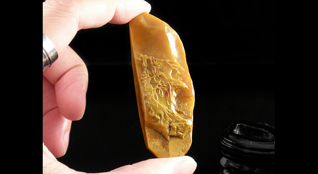 掘性昌化帶皮田黃凍石薄意章,掘性的意思就是指不是礦產的,不是礦產的意味著不是從礦脈中挖出來,而是自己獨自脫離母礦再外的”獨石”,通常冠個”田”字,不是指它是田黃,是指”掘性獨石”的意思,例如都成田、鹿目田、盧蔭田、坑頭田、浙田等等都以這個意思為名。