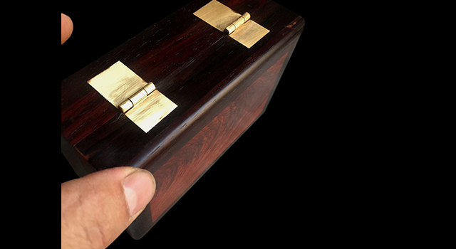 【雕飾】:配頂部花梨水波紋鑲黃銅文盒