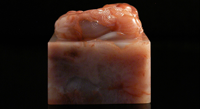 【雕析】:流水紅紋凍-臥獸回首鈕正方章