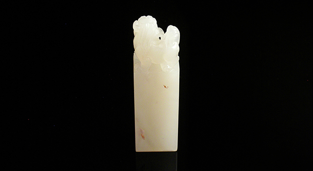 【雕析】:老撾玉白凍-獅子戲球鈕日形章