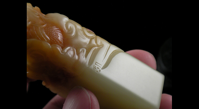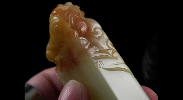 【石質】:石種為優質三彩紅黃白芙蓉凍,三彩性紅黃白芙蓉嬌艷潤美,美的過火,妖艷迷人,光線下看起來顏色更超嬌豔,光彩四射,這種品相的石種與稀有度不須贅言介紹,實為現下最狂熱追逐的芙蓉類珍愛,通透性質地尤難得少見,有可能一輩子都買不到這種程度的結晶三彩性紅黃白芙蓉,市場上此類石種多取巧色而作發揮藝色相配。此章巧色運用一流,光澤由內煥發而出,質地老性極乾淨略透凍,潤而不乾,不像新芙蓉偏鹼得不知所謂。已無新性石頭的銳氣,手感凝潤,瑕不掩瑜,兩道隱格化作流雲表達神龍見首不見尾的雲龍穿插其中,石性已穩定不用上油,表面已隱隱形成包漿。巧色豔麗(別懷疑,就是這麼豔麗),燭紅部份化作火球、艷黃部份化作龍身,白的部份就作印體部份,這從色澤明亮而不暗沉、以及凝結的質感、均勻的亮色即可肉眼判斷。那種巧色配上好地子的芙蓉質地,隨意擺放,也能展現眼光收藏魅力,是值得私藏的一方好印章。