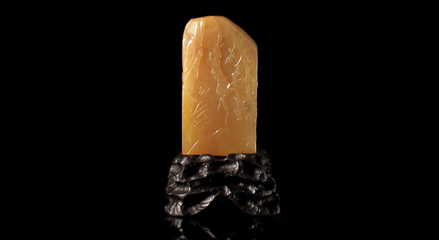 【石種】:田黃石素稱為「印石之王」的美譽,是中國特有的名貴雕刻石材。其特點是石皮多呈微透明,肌理隱現細密的羅蔔紋。質地細密溫潤,透明度高,又因產量極稀,故昔日有「一兩田黃一兩金」,後來更因佳品難覓,又有「一兩田黃十兩金」來形容其物稀價昂的程度!田黃石有白田、紅田、灰田、黑田、花田、硬田等品種。在林林總總的印石中,田黃突出地顯示出色澤、性狀的自然美,具有卓然的個性。田黃的色澤,以沈著而純淨的深黃為基本色調,這是中國傳統欣賞心理所喜聞樂見的色澤,被認為象徵寶貴。同時從質地和內在肌理上看,田黃石同時在這些方面都達到印石中最高的標準。田黃石具備性狀上的優良品質,獲得卻不易。