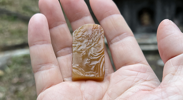 【雕功】:雕工精細,簡樸有神、印身巧作梅花薄意,枝幹交錯,點點盛開數朵,顯示出在寒風中的孤傲與頑強,極具文人氣息。