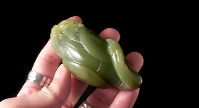 【石種】:月尾石,又名牛尾石,出產於與善伯山相連的月尾山的山麓之中。月尾峰樹木茂盛,青翠蔥蘢,猶如一位盛裝有倩女,與“和尚頭”一般的高山峰迥然有別。這裡還有一條小溪流入壽山溪,兩溪交匯處稱之雙溪,山青水碧,景色誘人。月尾石質地細潤而較鬆,微透明或不透明,肌理中但有白色或綠色斑點。主要有綠、紫二種,色澤深淺變化不同。其品種有月尾綠、月尾紫和艾葉綠月尾石等。月尾艾葉綠,南宋梁克家在《三山志》中記載:“壽山石,潔淨如玉,五花石坑,紅者、紺者、紫者、髹者,惟艾綠者難得”。明代謝在杭評壽山石以“艾綠”為第一。可見古人十分推崇艾葉綠,甚至尊為壽山石之首。傳世的艾葉綠石罕見,有人認為早已絕產。現在人將月尾綠中色澤如艾葉者稱為“艾葉綠”,為了與古時的“艾綠”有別,應稱之為“艾葉綠月尾石”為妥。