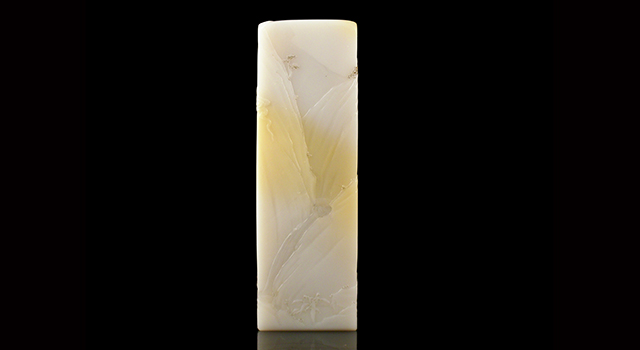【石質】:難得優質老性李旗降,作品石質手感超細膩,其實這種述說有點多餘的,因為對印石有認識的朋友,就天底下也知道旗降是特細膩特別穩定的好石頭! ….. 這東西溫潤細膩,可愛凝結,質地局部通透,材質的溫潤光澤,很是教手指頭心醉,如果手指頭有嘴巴飲酒的話!章體的下部份有明顯開門的旗降(花生糕味),少了吵嘴,沒有了什麼可會煩惱的。在色澤上來說,那一抹黃和乳白色白如白膏,相明快而清晰,中間那透徹的晶地,洞天物外,這旗降這尺寸市場上實是少見。全品無裂無瑕疵,表面已形成薄薄包漿,更顯光澤,小有充滿靈氣有獨特的藝術之美,光彩四射。