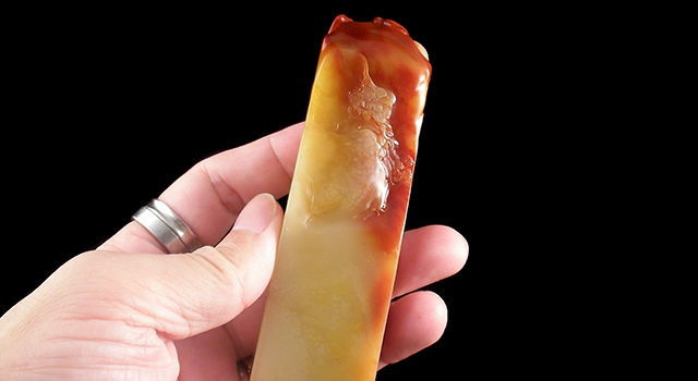 【雕工】:這雕功屬圓雕配高浮雕類作品,人物仕女主題,圓雕仕女主題的印鈕不多見,因為作品極難掌握得好,極考雕功與底子的能力活,也考石頭的各種條件,搞不好所有全廢了,……. 執扇仕女國色天香,絕美的人兒面蛋配絕美的料子,一切都是最好的!所以市面動物鈕、古獸鈕、花草等的雕師大師多蘿蘿,雕工搞不好一般的也能出個貨生活生活一下。但仙佛人物圓雕的師傅出不了幾個大師,因為作品除要比例形像外,還講一道五觀的神韻題,仙佛仕人講神韻,神韻在面相,面相在五觀、五觀在眼神….. 一點馬虎不得,搞神韻這道題許多人是腳軟的…….. 說回這美物吧,就雕功而言,美人衣紋飄逸、面相顧腰回首,豐膄圓潤,曲態玲瓏自若,衣袂轉折順暢、手上執扇輕撥簾弄,線條柔美,傳統中國仕女美態的婀娜多姿,令人心生愛憐。旁邊岩石繁花粉蝶。從佈局構思到雕刻枝巧,都細膩入微,刀法流暢,必是大師傅所出,追不了作者,但從構思深度到雕刻枝巧,已沒什麼話要說了。