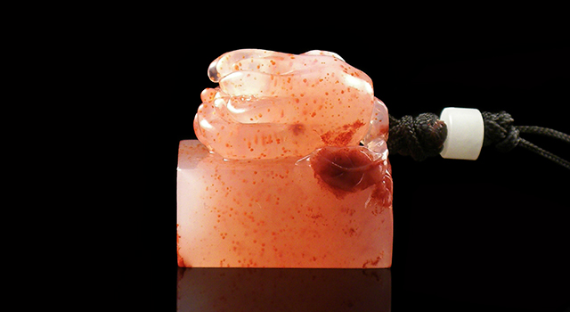 【石質】:這是一方壽山全玻璃地,水洞桃花晶,沒錯,達晶的水平,稱它為”水洞桃花晶”絕不為過。作品頂級料子,色澤鮮豔,水頭光感蠟質都非常好非常足,全章密密麻麻桃花,顆顆粒粒分佈的非常均勻,桃花點點亮麗飽滿,溫潤濃鬱水頭好,色澤紅艷結晶玻璃地(滿帶桃紅色),桃花分佈清晰、玻璃感十足,通透感非常強烈,達到全玻璃,質感之強烈如同冬天小河裡的冰晶,到達傳說中毛奇齡的- 桃花水景界,肉眼隨意可視的實屬少見。刀感爽脆,性穩不髮乾,油性足,質性穩定、密度非常高,完整無裂絕品。為不可多得的桃花晶,畢竟這等石不多見,屬於真正的精彩絕倫的作品,是一方最精華的石魄。