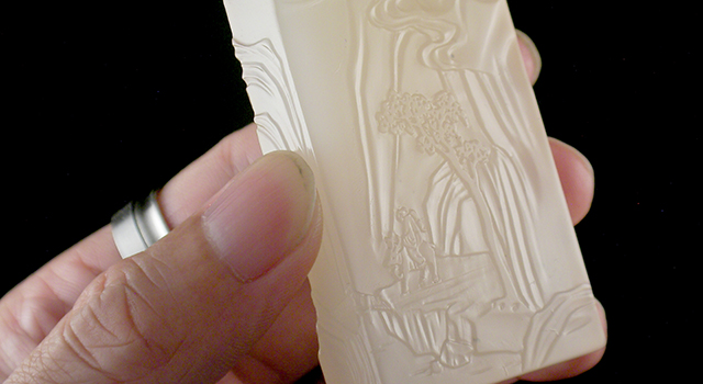 【雕功】:王文龍作品,工價過萬的大師,他的東西有他獨到和玩味的地方。作品蓬萊仙境鈕長方章,人物山水雲林意境派,處理的很好,意景精緻,如遊仙境,作品屬淺浮雕和薄意雙混合發揮。作品兩岸山壁危危,亭台隱藏其中,頂上孤雲飄渺,小橋流水在下,施藝佈局,畫意精密! 幾位賢者與騎鹿仙人山間相遇,各點綴神合,工藝細節,設計整體神韻不凡,意境深遠,內韻令人尋味。 好的工藝附與作品內容與靈氣,產生很大的想像空間,晶透石上看薄意拍照有點困難,大家看托片吧。順便也叫王老弟為我把這作品補個合照和下款。