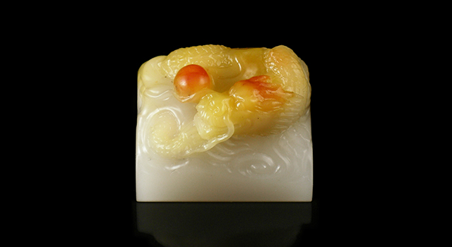【背後典故】:作品細膩精緻,背後沒什麼大故事,這裡就多說說這件石頭吧,作品入手細膩光滑、品相極好,上手把玩手感極好!印章的巧色迷人,壽山石的印章常有巧色之舉,有巧與無巧是有神與無神之別。在通往登峰造極的作品上,通常能見到巧色的影子。巧色似乎更加青睞蠟性的石頭,它可以是汶洋,也可以是芙蓉,也可以是高山,四大國石中尤獨厚壽山,其產七彩皆具,成了能巧善巧的好發揮,頂部的黃色或紅色展現著各種嬌姿,勾起喜石之人的色欲。好色是人之基本,好金石文化的美色,我相信各人皆可樂也!
