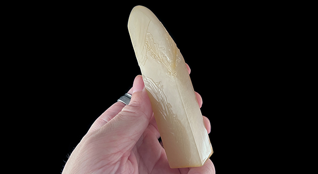 【石質】:作品取材壽山的荔枝凍石,老開門的石頭、根本沒有什麼懸念,肌理滿滿荔枝的蘿蔔絲,荔枝質地上佳、荔枝的味道明明白白,大開門的好東西。質地優良,體現局部帶黃冰糖地,內部通透純正,光滑油潤度高,非常乾淨俐落,明亮自然,章身有局部小黑針薄意化之不影響品相,這作品個頭修長,手感凝潤,細膩度高,入手手感上佳,成尺寸上檔次,握權有餘,已包漿、可干放。適合高端品位把玩觀賞。印頂有兩道黃根薄意梅枝!荔枝洞有石中妃子之美譽,壽山代表性石種,荔枝石基本的礦洞都已封礦,收一件少一件。相信大家對荔枝應該不陌生,這裡就不作過多述說了,大家看圖自鑒吧!作品連托片、合照和證書!
