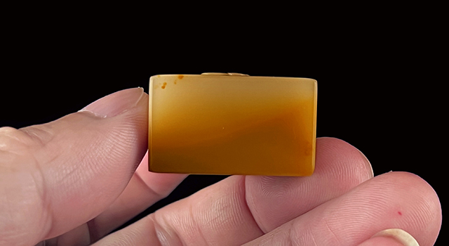 【雕工】:這是一方圓雕風格日形章、福州東門派古獸鈕,平台印上雕刻古獸鈕,古獸為蠣虎類,雕功精彩,古獸的延頸轉首望前,栩栩如生,雕得非常承傳古制,是福建古獸雕鈕的常表飾風格, 石質迷人,藝人善用巧色,俏色分明,古獸嘴巴鼻子濃黃凝艷,細緻而有獨特風韻、是方引人的小古獸、方寸藏乾坤的好作品。好東西就讓它自已來對你說話吧。