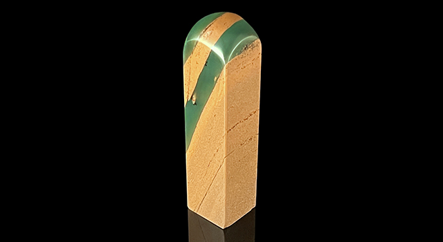 【石種】:“雅安綠”,又稱“川綠”,“四川翡翠綠”,“四川綠”或“新綠”,乃近年繼“西安綠”之後發現之又一優質印章石新品種,其市價已超“四大名石”。出產地在四川雅安。四川“雅安綠”色如翡翠,這種石頭莫氏硬度在3.0左右,色澤青翠鮮豔,常與銅礦、黃鐵礦、黃褐色粗石伴生。質地堅結細膩,微透明或半透明,產量少而多伴有金屬礦物質、砂釘、水草等等雜質,故純淨者難得,原石中很難提取出純粹的綠,能成章料者更是少之又少。紋理有時有若隱若現的“水草”紋伴生其間,頗有意趣。由於資源該礦脈稀少,價格更是每日水漲船高。