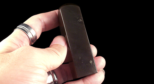 【石質】:牛角凍,是珍稀品種,眾人皆愛,赭黑色,黑中透出紅氣,有的肌理有紋,如牛角之紋理。此正宗壽山石牛角凍石,為壽山石中稀缺的品種,成尺寸上手沉穩,用手把玩起來溫潤細膩,感覺充滿靈氣。非常難得的作品,透光照進去為微紅透,整個作品容光煥發,肌理透明凝靈,有坑頭的金砂,若隱若現,其質地溫潤,通透,通靈澄澈滑潤,滑不留手,性也極為穩定,可以乾放,該作品的材料本身就可以作為稀有品種收藏,加之其作品有深遠意義。