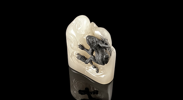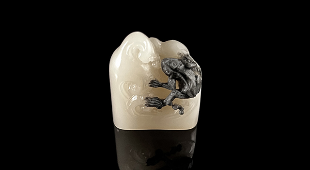【雕工】:作品非常出彩,很簡單的巧色處理,就是一件精工美石,雕刻手法是運用了高浮雕技法,很到位的運用一黑一白的兩種眼覺差、一晶一硬的石性比較,作為創作的分水嶺、部局和巧技處理。印鈕上化成青蛙在池塘中、踏著水波的一件文房器印章。工藝好巧色好,小青蛙形態也很好,還有添上水面旁的幾顆青蛙蛋蛋,細節位一點也不馬虎,作品到味的小精品,總體很可愛,東西實在不錯。