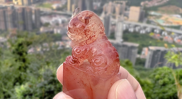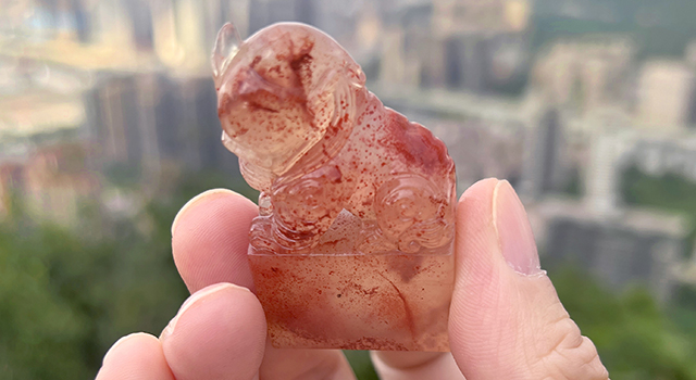 【石質】:這是一方取材絕礦的壽山水洞桃花,正宗的水洞桃花名貴,一料難求,結晶的程度達到桃花晶的水平,稱它為「水洞桃花晶」絕不為過。頂級的桃花料子,微帶蘿蔔絲、色澤鮮豔,水頭光感蠟質足,桃花要全章密密麻麻,桃花點點,顆粒夠分明夠明顯夠飽滿,溫潤濃鬱水頭好,色澤紅艷結晶、全玻璃 地(滿帶桃紅色),桃花分佈清晰、玻璃感十足,結晶通靈,肉眼隨意可視的實屬少見。作品密度高,刀感爽脆,無油自潤、此料石性穩、老東西易保養不發乾,溫潤細膩、光滑油潤,石肌理有兩道紅根,不是裂格,完整無裂。為不可多得的桃花凍,畢竟這等石不多見,屬於真正的精彩絕倫的珍品,是一方最精華的石魄。