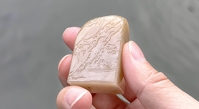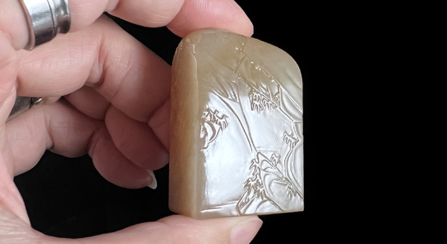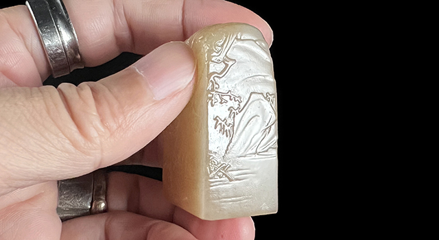 【背後典故】:石頭要有觀賞價值、進而才有收藏價值,最終才能體理經濟價值。要感受美物的美好,需要托片和實物同步欣賞,才是最賞心悅目的視覺美宴。小堂初上手這東西時感受很美,知道美物不易,拜托香港某老師為這舊物出了托片,就馬上被這一坡托片中視覺美震撼到的,小舟在桃花樹下的伸 延下江中泛浪,舟中東坡伸手遙指,回首與同遊者論盡古今風流人物,方寸間乾坤萬千、視覺感受很神!舟下水紋藝師輕拖幾刀、波光意理就滿載而歸、見易行難、需要大師傅才掌握到位、印體四面山壁危危,樹影壁上四伸而出、各點綴神合,畫中疏密濃淡點綴有序,輕重密淡層次分明,畫意石中自生,意境深遠。作品有文氣,內韻令人尋味、足證雕師之對石頭用心營神,可惜老藏家舊物已經追查不出作者。