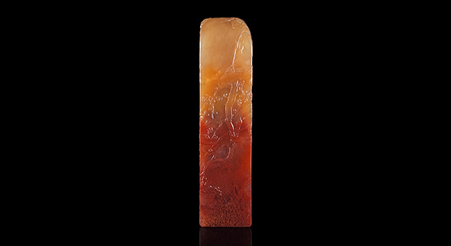 【石質】:作品質地結晶,屬高山水洞硃砂凍,色分紅橙黃三色,反光中,猶如玻璃。加上印章中間以下部分硃砂的存在,粒粒硃砂似欲透體而出。艷紅硃砂和橙黃色相,色澤明麗高雅,嬌豔通透,相當養眼。作品晶瑩通靈,那真是難得又讓人陶醉。細膩光澤的手感,石性密結,這類如此出彩的高山水洞硃砂,這種美物 過去是價高不可昂視的東西,體現出壽山石中最極致頂好的存在。也是小堂收藏之中,最好的水洞硃砂,作品令敝人愛不釋手,其他具體請君見圖自鑑好了。