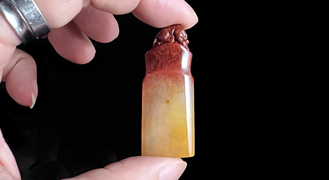 【雕工】:福州圓雕類雕功,作品古獸鈕,巧色處理鴻運當頭,古拙古樸。越玩越有味道,清逸高雅,石質縝密緊,從表面上看色澤溫潤沉渾,純淨柔和!不需要追慕名家,也不追體積的大,只要方寸內藏亁,工韻質美,已經是吸睛的硬道理。