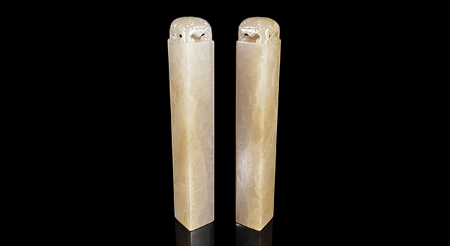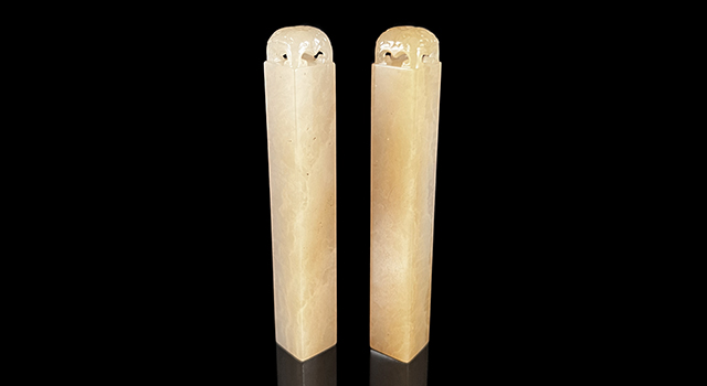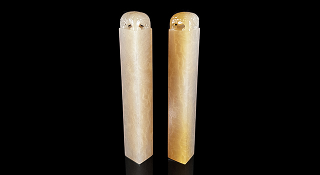 【雕工】:作品鈕雕主題西周博古青銅紋飾,正對章。早期師傅作品,功架非常好,雕工精緻高雅,雕琢傳神、線條流暢有力精練,紋飾精湛,題材印鈕上博古配合樓空工藝,樸拙而生動,平直的印臺之上,巧用內翻蹄四脚抬升樓空博古紋飾,層次的表達上就能遵循博古古制,作者運用大比例印體部份留白,純粹讓讀者體驗荔枝石質的美好。作品清黃色相明快,文質相映,使得對章配合無間又有君子之美,滿滿文房雅氣,十分好看。此類博古風格在很多優質的印材上尤其奉行推崇。