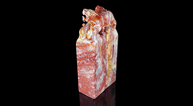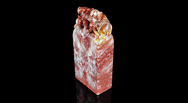 【雕功】:傳統的福州圓雕類雕刻風格,虎鈕正對章。傳統雕刻老虎,神態上,要有不怒而威感覺,也有呲牙怒目的,有些虎是憨態可掬的,十分可愛,各有各精彩。這方虎鈕昂首端坐,作者運用花坑石巧色處理,結晶流動花紋的視覺感覺,化作老虎身上紋理,對章老虎如駐立於崖石之巔,半側回首,對天長嘯,露出鋒利尖銳的牙齒,四周仿佛都沉浮於虎威的長嘯之下,一幅萬物皆“以虎為王”之態,很是耐人鑒賞。
