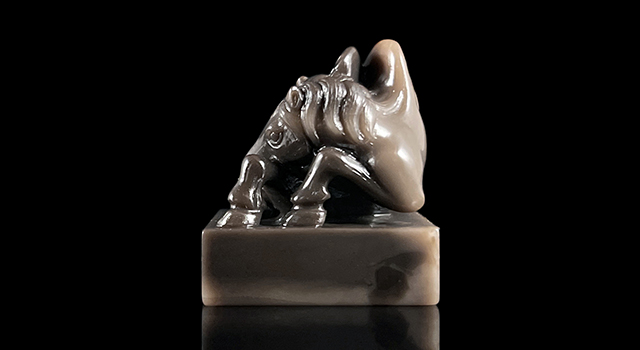 【雕工】:神獸天馬鈕,局部用現代風格,和福建傳統制式天馬走不同路線,馬體按實馬鈕的雕刻風格,配上天翼,比傳統古代天馬 更加強化雙翼的比例,為了體現雙翼的視覺衝擊,雕刻家把羽毛誇張表達,馬身閒伏回首姿態,天馬回首泰然、臥姿神情優雅閒適,作品線條挺拔有力、造型雅緻,印章雕工出彩,整體秀氣,線條圓潤帶樸韻、比較能符合有要求的朋友。