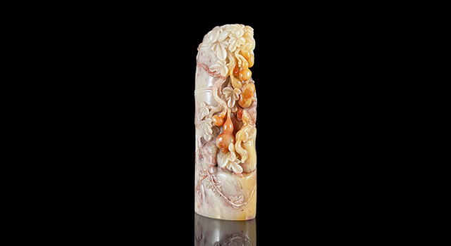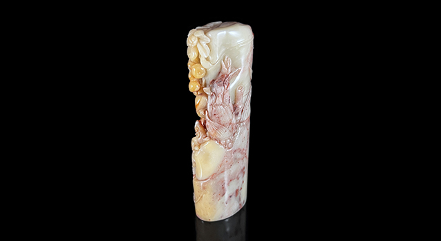 【石種】: 旗降山礦脈位於壽山鄉壽山村北面的旗降山一帶,該礦脈出產礦石的外觀特徵,質地溫潤滑膩,粗細不一,多為不透明或微透明。旗降石又稱(奇艮石)或(奇崗石),產自旗降山,以產地名。礦洞開發於明代未年,到了清初已負盛名。 20世紀中期產石石質最佳,微透明、堅細溫潤,富有光澤,且石性穩定,經久不變,深得鑒藏家稱道。近年所出品質略遜。而旗降石的品目,分別以色相、礦狀及開採年代取名。如旗降黃石、旗降紅、旗降白、旗降紫、巧色旗降、銀裹金旗降石、金裹銀旗降石、掘性旗降石、老性旗降石、新性旗降石等等。而這方是屬旗降石中的銀裹金旗降石,銀裹金旗降石指外表包裹白色層的旗降黃石。其以皮層呈微透明狀,脂潤純淨。色界清晰為上品。