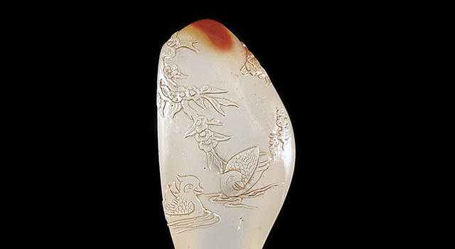 【背後典故】:這件作品怎麼說呢!本來東西是某某朋友的,作品是薄意隨形章,東西當年初初遞給小堂時,我是眉頭一皺的,薄意的雕藝真的很爛,各看官可以參閱鄙人提供未處理的前後圖就懂。我沖口而出說,怎麼這對賤鴨表情那麼欠揍?感到鴨子滿腦子裝滿壞水主意…… 物主連連回話說這對是鴛鴦,泳中戲水。我靠!見過很爛的薄意功,未見過如此爛的,實在汗背,邊款也很爛,巧色沒用上,除了石頭優好,其他一切沒有一樣能有看頭,白白浪費了一件好材料,本來一件應該文氣高企的作品,反而給施藝者糟蹋了,有一種帶千里馬去耕田,攘伯樂去捕魚的感覺,實在可惜…… 可能鄙人有種美物要求強迫症,為了不讓美物蒙塵,美人含恨,東西我接回來後,吩咐好朋友雕刻師,為她度身訂造,脫了這件村姑衣裳,先為她還原冰肌玉骨吧,將來如何度身量度旗袍,等援了這道氣再說。