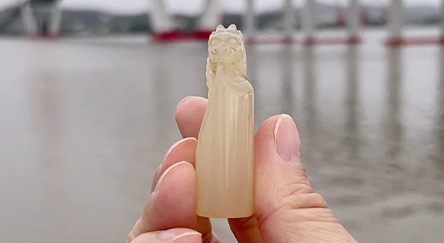 【石質】:東西屬壽山石舊物,水坑的坑頭晶極品,這樣的美石存量真的少,也只有水坑的石頭,才能有如此晶瑩凍透的質感。坑頭大部分面目是灰色或者比較暗的,或者多雜,這種結晶度,在坑頭類來說,可以是天花板了。玻璃地的料子,料子很有特性,質地瑩潤凝結,晶凍通透,全體純淨,可以隔石觀字,非常靈動飄逸,是石質透徹通靈的一塊好料,作品已經經過主人多年盤玩, 出現完美包漿,鐵干干歲月藏玩的痕跡見證,就是因為這種古樸之美,作品古味十足,成尺寸一拳之物非常有握感,東西完好無裂,沒有黑針,完整性穩,經得起時日洗禮、值得收藏的美石。