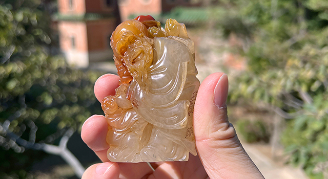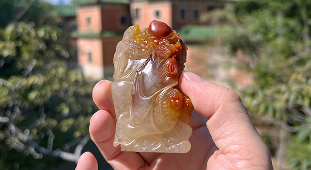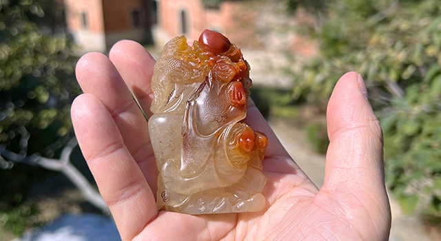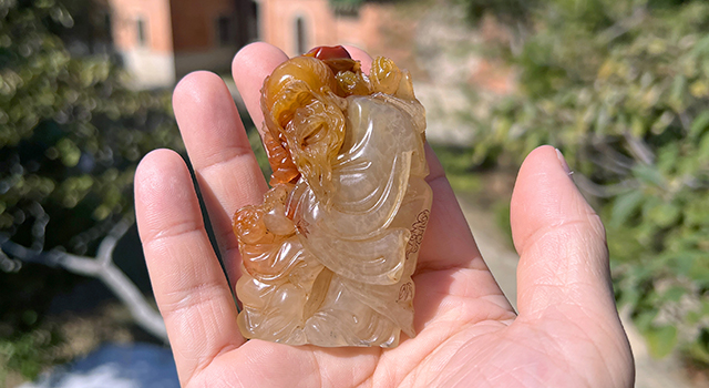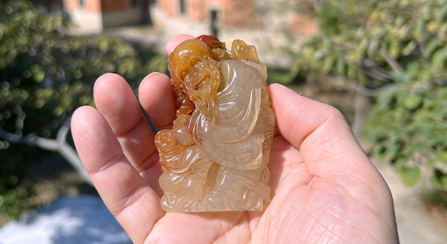 【雕工】:這雕功屬福州傳統圓雕類作品,作品東門派舊工法,主題仙翁賀壽,作品因材施藝,仙翁頭髮開絲,表情愉悅,笑容歡樂,鬢鬚飄逸,就算隔著屏幕,也可以看見老翁的開懷表情,仙翁肢體手握蟠枝背着蟠桃和佛手果,巧色色澤紅潤艷麗,仙鶴盤踞在仙翁背上,小童託着蟠枝,纏繞仙翁腳下,手握蟠桃,小童局部紅黃色處理,巧色引人,黃玉地部份晶瑩如冰玉,賀壽喻意的氣韻滿滿,充分表現民間喜氣洋洋,整體生動趣味,奇樂融融。可見作品雕工精緻,整體工的鑑賞及藝術水準兩項也到味,堪稱賞玩皆具。