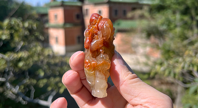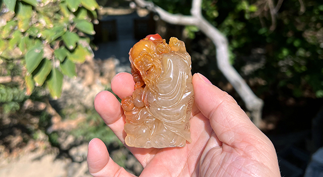 【石質】:荔枝洞有石中妃子之美譽,壽山代表性石種,荔枝洞石本就稀少,基本礦洞已封礦,現在市場成孤品了。這件作品是壽山石三彩荔枝翠,令人垂涎三尺的,作品色彩豐富,艷麗無比,紅橙黃白各色皆具,巧色分明,1995年的作品,年代久遠,包漿醇厚,屬於有時日的作品。東西達到荔枝石中最棒最頂質的質級,滿滿蘿蔔絲,配上巧色冰糖地,石性通透,一流的貨色,質地油糯,手感細膩,光滑溫潤,晶瑩透徹,明亮自然,乾淨利落,東西美得明快明白白,清清楚楚,絕對沒有任何爭議性,方家玩的就是這種老味道,開門到代到料,現在市場成孤品,收一件少一件。