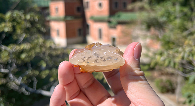 【石種】:荔枝石產於1987年,因開采的洞前有棵野荔枝樹及質色嫩白如荔枝肉而得名。由於此洞和太極頭仳鄰,質細嫩而靈透,近似太極頭,結晶體以白色為典型,白者晶瑩潔白,清靈者似水晶,通體含細而綿密清晰的網狀蘿蔔絲紋,偶含白色片狀結晶砂或黑色細砂紋,有紅黃白黑等色,未見有青綠色。以黃為貴,黃者呈粉黃或透明鉻黃;體白飽含黃絲紋或體黃含白絲紋者稱為「哈蜜凍」,頗為澄淨明媚;以純紅者較為稀有,一般呈不太通明的紅豆色,少數呈紅豔的暈紅凍狀或桃花點狀,亦極為珍罕名貴;色兩邊白中間呈黃或紅者,似三合板者,稱為「夾板荔枝」;也有二或三色的巧色荔枝;亦有油白、玉白微透,質潤結但不透明、絲紋不顯者為「老性荔枝」。荔枝洞的質地、靈度比高山其它礦洞凝靈潤結,以「紅妹洞」所產質色最佳,產於一九八七年,盛產期僅約二、三年,所產石的質色也最好,近年已經竭產,以後陸續產出的零星礦塊,質量略遜,因此精品價格暴漲。後期出產的新坑荔枝,已靠近雞母窩礦脈,質色近似雞母窩。以材巨而瑩澈的荔枝晶為極品,色渾、灰黑、多砂丁者為次。收藏時應選色澤柔美或清靈潤潔如晶、少片狀白砂及黑砂丁者為佳。