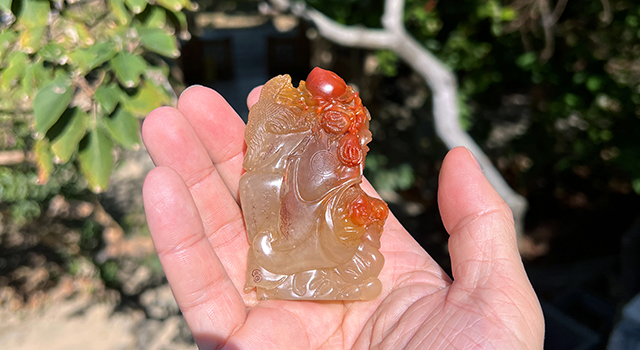 【作者】:林霖(1968年~),福州市晉安區鼓山鎮人,高級工藝美術師、畢業於江西景德鎮陶瓷大學美術系,福建省高級技師、福州市名藝人。師從父親林元康(中國工藝美術大師)、後又拜福建省工藝美術大師阮章霖學藝(福建省工藝美術大師),並得到陳敬祥等多位大師的悉心指導。創作融合美術雕塑理念,擅長壽山石圓雕、高浮雕與俏色雕刻技法,所創作品多次參與國家、省及市展覽和評獎,並屢屢獲獎。代表作《彝族風情》《天道酬勤》《西山放鶴圖》等50餘件作品獲中國名石雕刻藝術展、中國工藝美術百花獎金獎。作品《母子情》、《西山放鶴圖》、《登高記》、《麻姑獻壽》等榮獲中國名石雕刻藝術展金、銀獎,《稻香千里》《悟禪》等作品被中國美術館、中國工藝美術館收藏。作品《東方朔祝壽》榮獲福建省工藝美術百花展一等獎,多次在新加坡、馬來西亞等國家及地區有舉辦個人作品展,當地媒體多次進行專題報道。現任第六屆福建省工藝美術協會副會長,福建省壽山石文化藝術研究會理事、福建省收藏家協會壽山石專業委員會理事、福州市壽山石協會董事。兼任中國工藝美術協會常務理事。 2022年獲全國技術能手稱號,主編《工藝品雕刻工》國家職業技能標準。