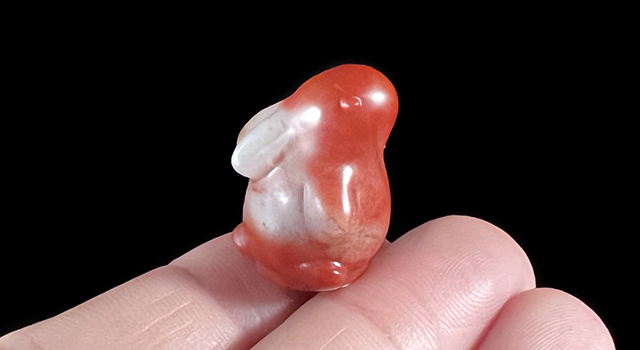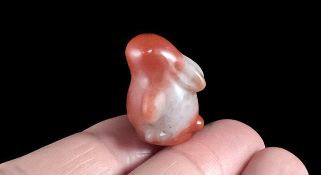 【雕工】:雕刻用新派圓雕類風格,配上隨形跨台鈕之風,純手工精細雕刻兔子,局部雕刻比例挪移和簡化,產生視覺上的圓潤笨拙,形體生動飽滿,滿滿Q版現代漫畫風特色,有創意,兔鈕乖巧可愛,仰首而立、眼神遠望,生動活潑,線條流暢優美,優雅迷人、給人的視覺感很舒服,印面呈正圓章。